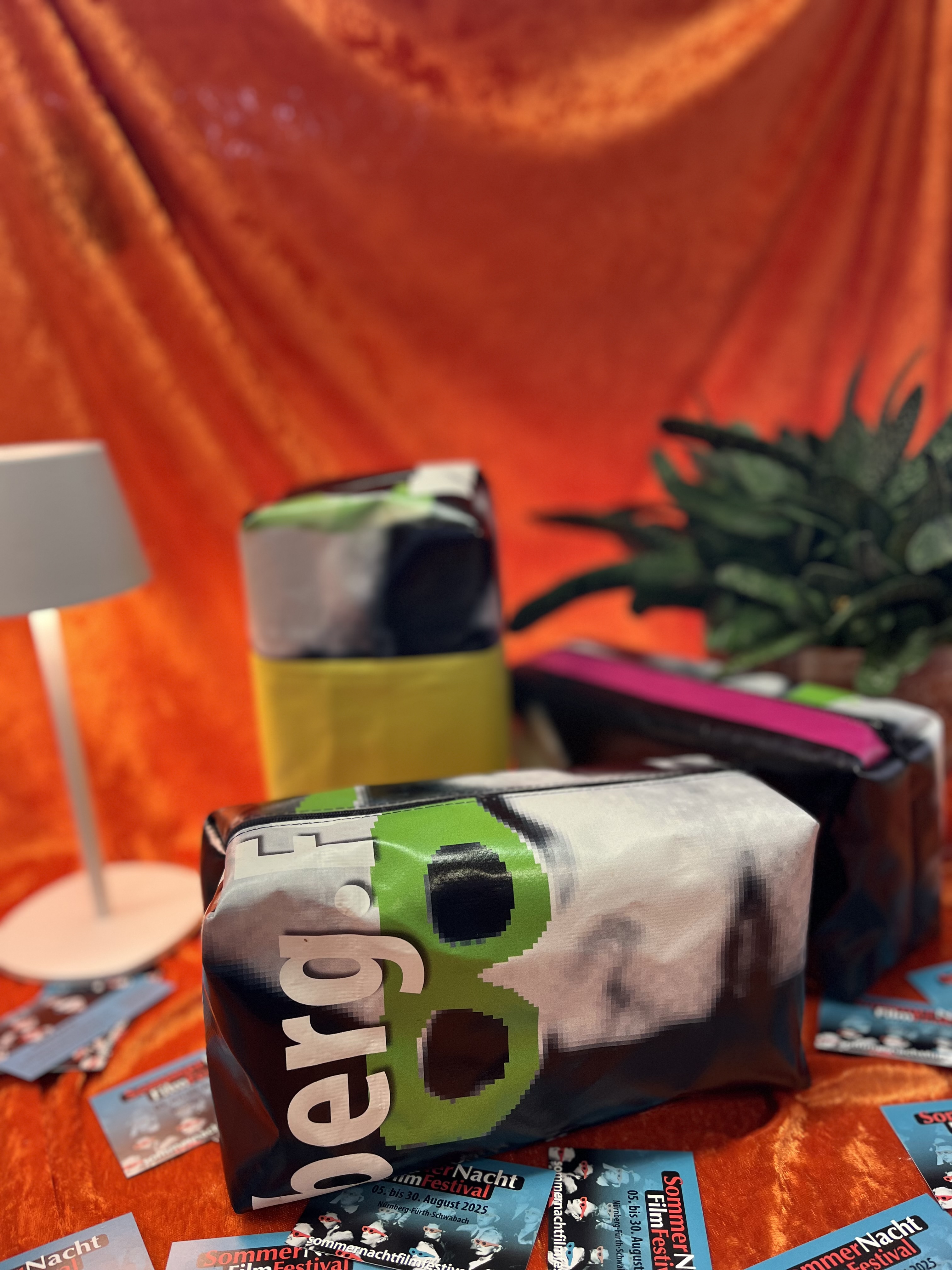 Diese individuellen Kulturbeutel mit Reißverschlüssen wurden in einer integrativen Maßnahme aus wasserabweisenden Werbebannern des Mobilen Kinos hergestellt.